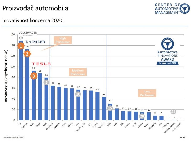 BMW je također dobro prošao s 88 indeksnih bodova te je dospio na četvrto mjesto. Kineski proizvođač SAIC slijedi na petom mjestu, a s Great Wall-om i Geelyjem još dvije kineske automobilske tvrtke ušle su u prvih deset na svijetu. S druge strane, japanske i francuske korporacije našle su se na dnu ljestvice inovacija. Najveći svjetski proizvođač automobila, Toyota, bila je tek na 13. mjestu, Honda na 18. Renault i PSA (sada Stellantis) stoje lošije nego prošle godine te su došli na 14. odnosno 17. mjesto.