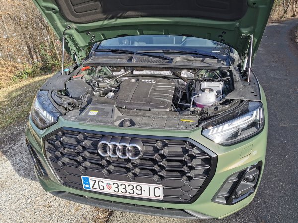 Naš testni model Audi Q5 40 TDI ima snažan dvolitreni (1968 cm³) četverocilindrični turbodizelski motor, s Common rail sustavom ubrizgavanja goriva i intercoolerom, koji razvija snagu od 150 kW (204 KS) i krasan najveći okretni moment od 400 Nm pri 1750 – 3250 okr./min. Aluminijski blok motora teži približno 20 kilograma manje od prethodnog motora, dok je radilica lakša za približno 2,5 kg. Blagi hibridni sustav (MHEV) doprinosi niskoj potrošnji goriva. Remenom pokretani starter/generator (BSG) napaja 12-voltni električni sustav vozila, koji uključuje kompaktnu litij-ionsku bateriju. BSG obnavlja energiju kočenja i sprema je u bateriju.