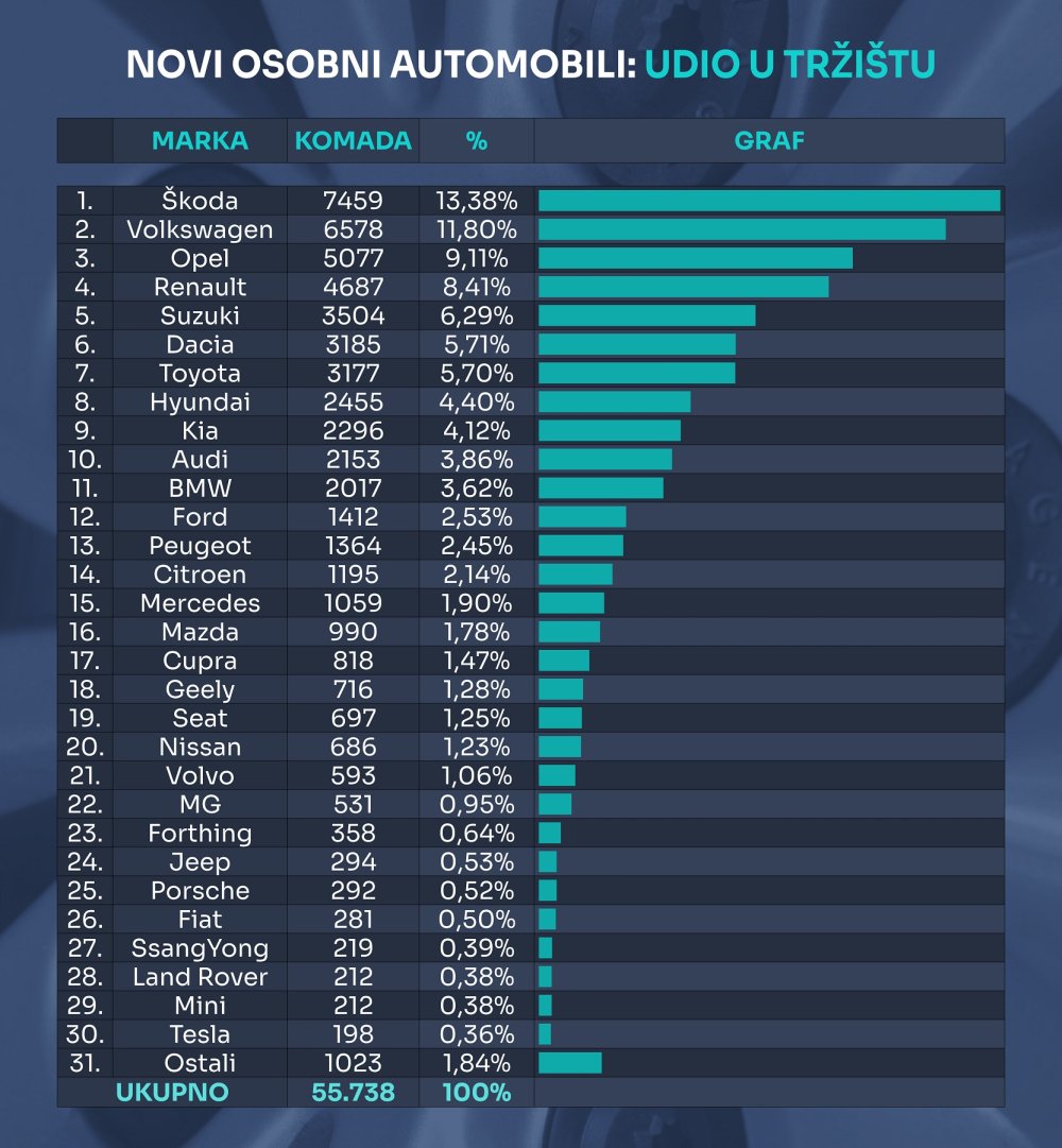 Vrh ljestvice prodaje novih vozila i nakon mjeseca rujna drži Škoda koja s ukupno 7459 automobila drži 13,38 posto tržišta. Na drugom je mjestu i dalje Volkswagen sa 6578 vozila ili 11,8 posto tržišta. Na trećem mjestu je i dalje Opel s 5077 vozila ili 9,11 posto tržišta. Prve tri marke drže ukupno 34,29 posto udjela na tržištu novoregistriranih novih automobila u 2025-toj.