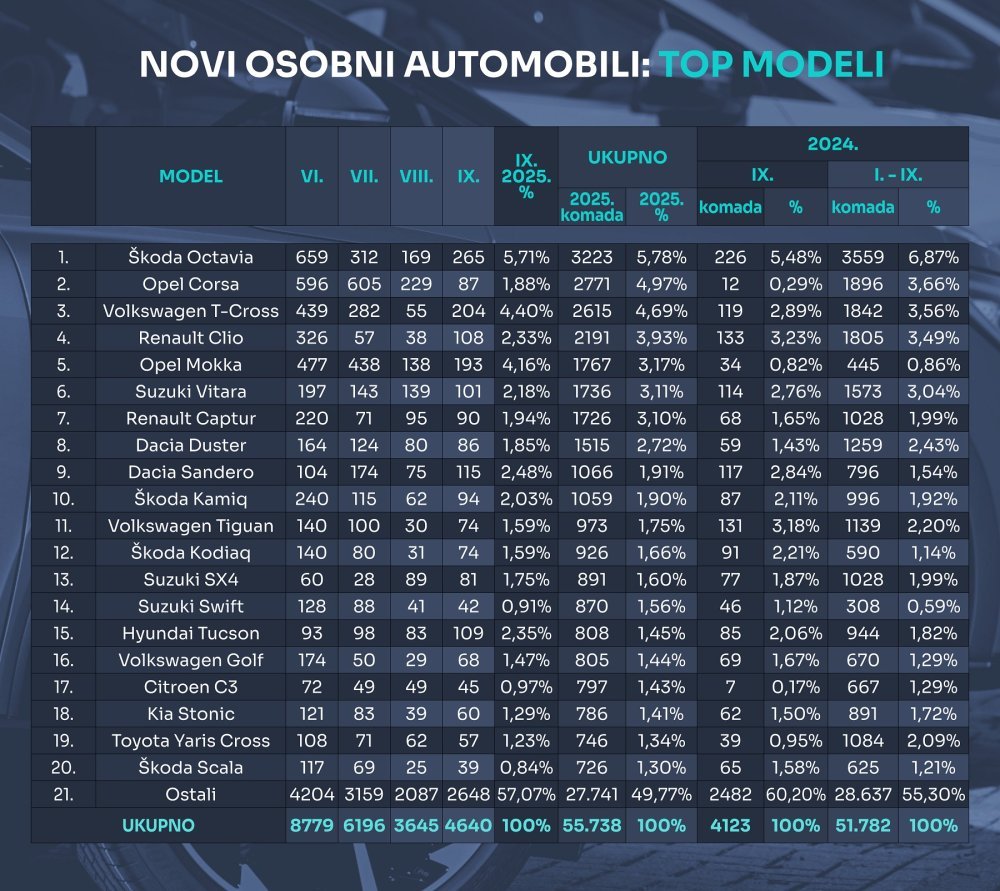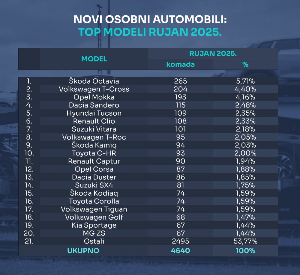 Gledamo li samo rujan 2025. godine, onda vidimo da je na prvom mjestu Škoda Octavia s 265 prodana primjerka. Na drugom mjestu je Volkswagen T-Cross s 204 komada, a na trećem mjestu Opel Mokka sa 193 komada. Četvrto mjesto je zauzeo Dacia Sandero sa 115, a peti je Hyundai Tucson sa 109 komada registriranih u rujnu.