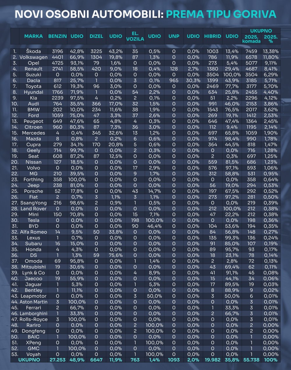 U donjoj tablici možemo vidjeti preferencije hrvatskih kupaca što se tiče vrste pogonskog goriva u 2025-toj. Ukupno je u 2021. godini bilo prodano 40 različitih marki automobila, 2022. godine 50, 2023. godine 46, a 2021. godine 40. U prošloj 2024. je bilo ukupno 53 različitih marki. Sada ih nakon kolovoza ima ukupno 53.