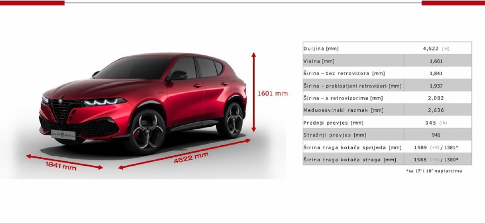 Što se vanjskih dimenzija tiče, osvježeni Tonale je neznatno kraći od izvorne verzije iz 2022. – duljina mu je 4522 mm, odnosno 6 mm je kraći. Ravnoteža proporcija poboljšana je kraćim prednjim prevjesom (945 mm ili -6 mm) i širim tragom prednjih (+8 mm) i stražnjih kotača (+8mm) zbog razmicanja 19"i 20" kotača po +4 mm prema van.