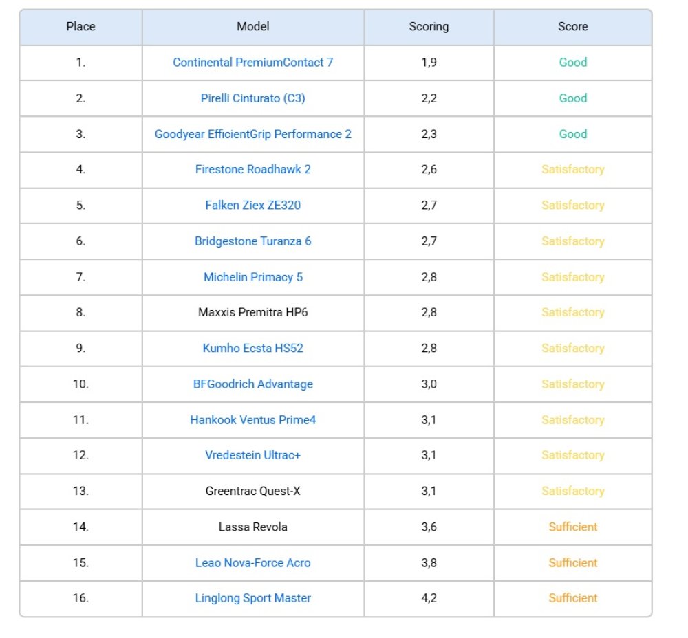 Prema ADAC-ovom istraživanju, najbolja guma je Continental PremiumContact 7 koja je dobila najvišu ocjenu 1.9 (što manji broj - to bolje) u spomenutom testu. Na drugome mjestu je Pirelli Cinturato (C3) s ocjenom 2.2, a na trećem GoodYear EfficientGrip Performance 2 koji je dobio ocjenu 2.3.
