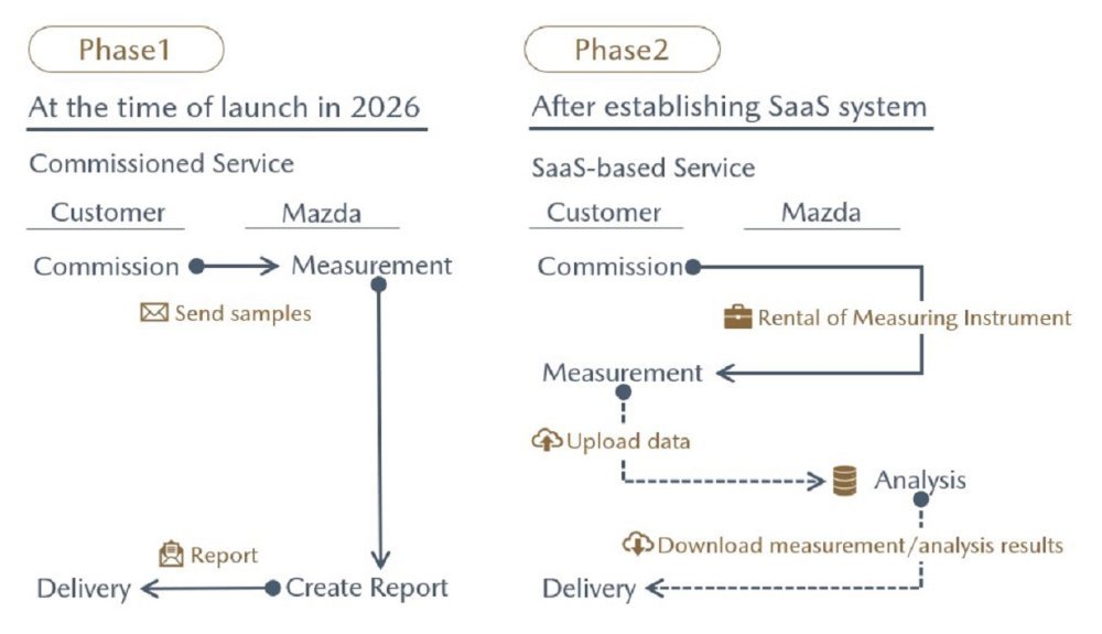 Mazda trenutno procjenjuje komercijalnu isplativost modela naručene usluge, pri čemu se uzorci koje daju partnerske tvrtke analiziraju pomoću Mazdine vlasničke dijagnostičke tehnologije, a rezultati se dostavljaju u neformalnim izvješćima.