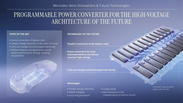 Mercedes-Benz također teži promjeni paradigme u korištenju nove generacije tehnologija energetske elektronike u električnim vozilima. U budućnosti bi programibilni mikropretvarač mogao nadmašiti ograničenja sadašnjih električnih inverterskih sustava i revolucionirati postojeće visokonaponske arhitekture.
