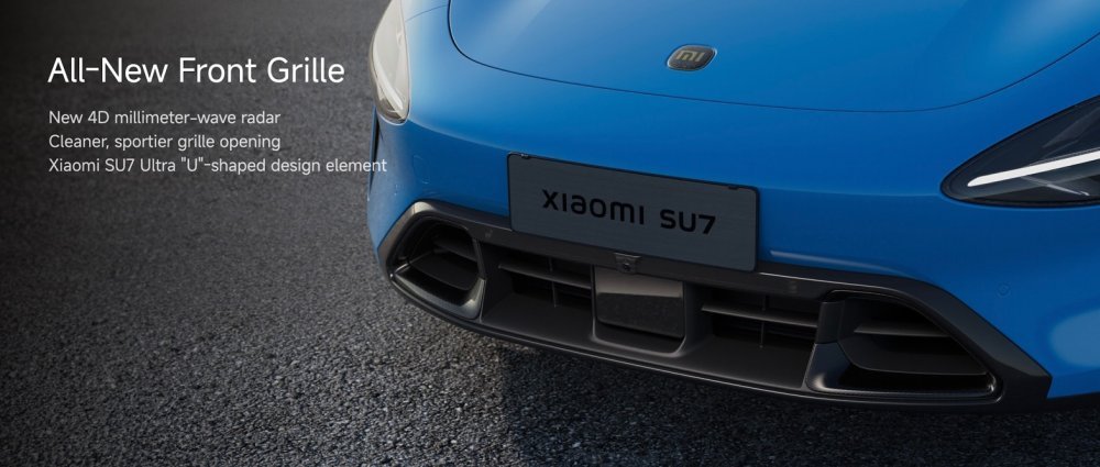 Najvidljivija novost redizajnirana je prednja maska s boljom aerodinamikom i integriranim 4D radarom. Konkretnije, uz nove boje, najuočljivija nadogradnja nove generacije Xiaomi SU7 je potpuno nova konstrukcija rešetke za dovod zraka. Sofisticiranog i sportskog dizajna, nova konstrukcija ima uvećani C-oblik dekorativnog okvira i šire kanale za hlađenje kočnica, dok je 4D milimetarski valni radar sada integriran unutar rešetke, što poboljšava i aerodinamiku i donosi mogućnosti pametnog očitavanja.