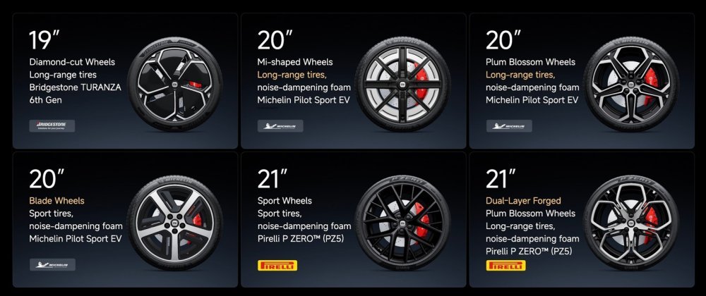 Dodatno, šest opcija naplatka dostupno je u cijeloj liniji nove generacije Xiaomi SU7, uključujući tri potpuno nova dizajna koji proširuju personalizaciju za sve stilove i ukuse. Nove opcije naplataka uključuju 19” Diamond Cut naplatke, 20” Blade naplatke i 21” kovane Dual Plum Blossom naplatke. Uz ove opcije, dostupne su i klasične opcije uključujući 20” Plum Blossom naplatke, 20” Mi-oblik naplatke i 21” Sport naplatke.