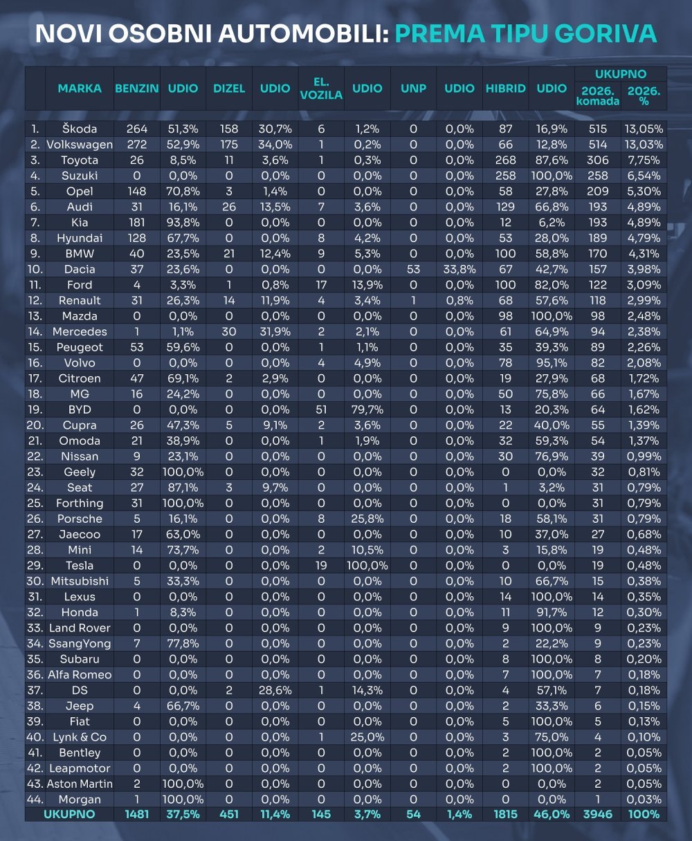 Vrh ljestvice prodaje novih vozila nakon siječnja zauzima Škoda koja s ukupno 515 automobila drži 13,05 posto tržišta. Na drugom je mjestu Volkswagen s 514 vozila ili 13,03 posto tržišta. Na trećem mjestu je Toyota s 306 vozila ili 7,75 posto tržišta. Prve tri marke drže ukupno 33,83 posto udjela na tržištu novoregistriranih novih automobila u 2026-toj.