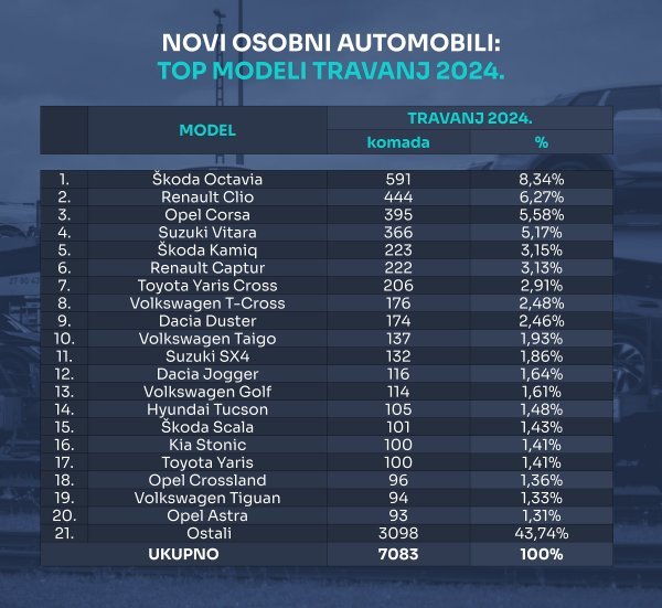 Gledamo li samo travanj 2024. godine, onda vidimo da je na prvom mjestu završio model Škoda Octavia s 591 prodanim primjerkom. Na drugom mjestu je Renault Clio s 444 komada, a na trećem mjestu Opel Corsa s 395 komada. Četvrto mjesto je zauzela Suzuki Vitara s 366, a peta je Škoda Kamiq s 223 komada registriranih u travnju.
