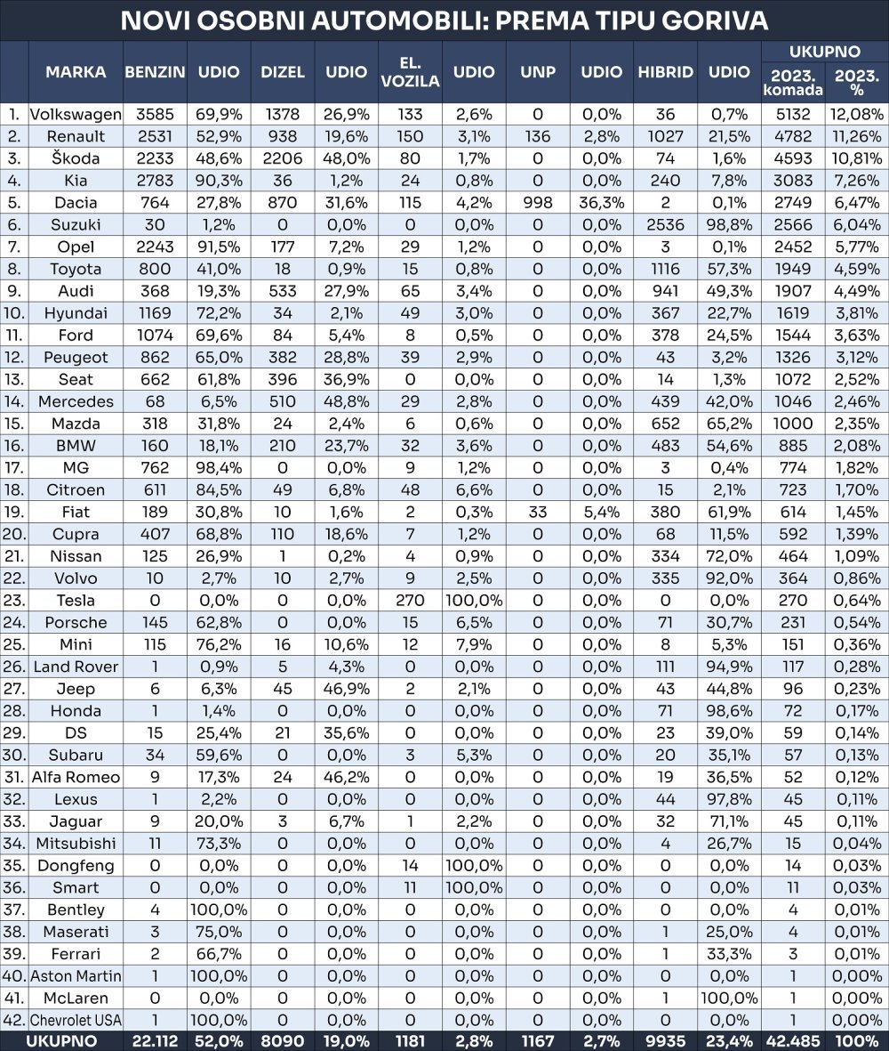 U donjoj tablici možemo vidjeti preferencije hrvatskih kupaca što se tiče vrste pogonskog goriva u 2023-toj. Ukupno je prošle godine prodano 50 različitih marki automobila, što je čak 10 marki više nego u 2021. Sada ih je nakon mjeseca kolovoza ukupno 42 različite marke.