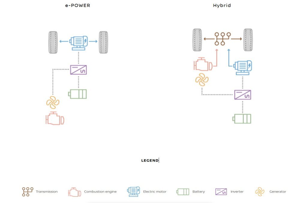 Rad sustava e-Power temelji se na jedinstvenom načelu koje korisnicima donosi stvarne prednosti: benzinski motor služi isključivo za proizvodnju električne energije koja se prenosi električnom motoru za pokretanje kotača i, ako je potrebno, punjenje baterije