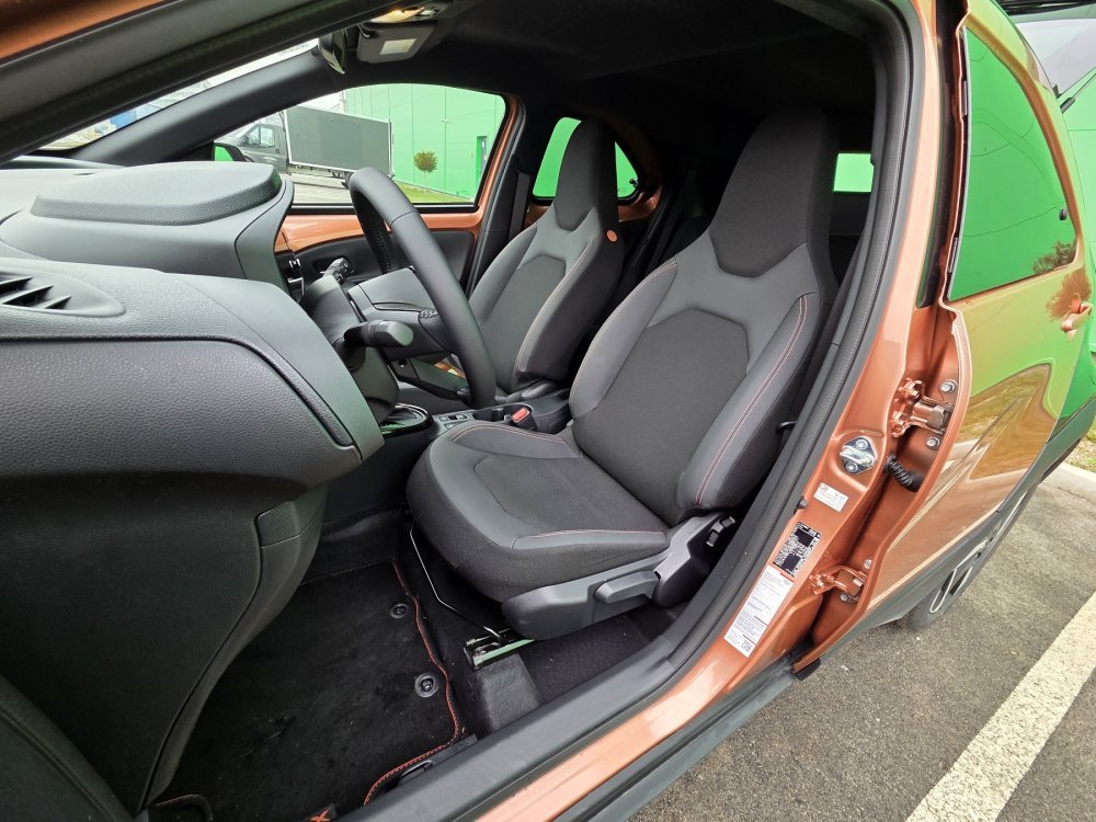 Vozačevo sjedalo je ručno pomično (naprijed-natrag), podesivo po visini i s ručnim podešavanjem nagiba. Suvozačevo sjedalo je isto tako ručno pomično (naprijed-natrag), podesivo podesivo po visini i s ručnim podešavanjem nagiba naslona. Prednja sjedala su standardno i grijana.