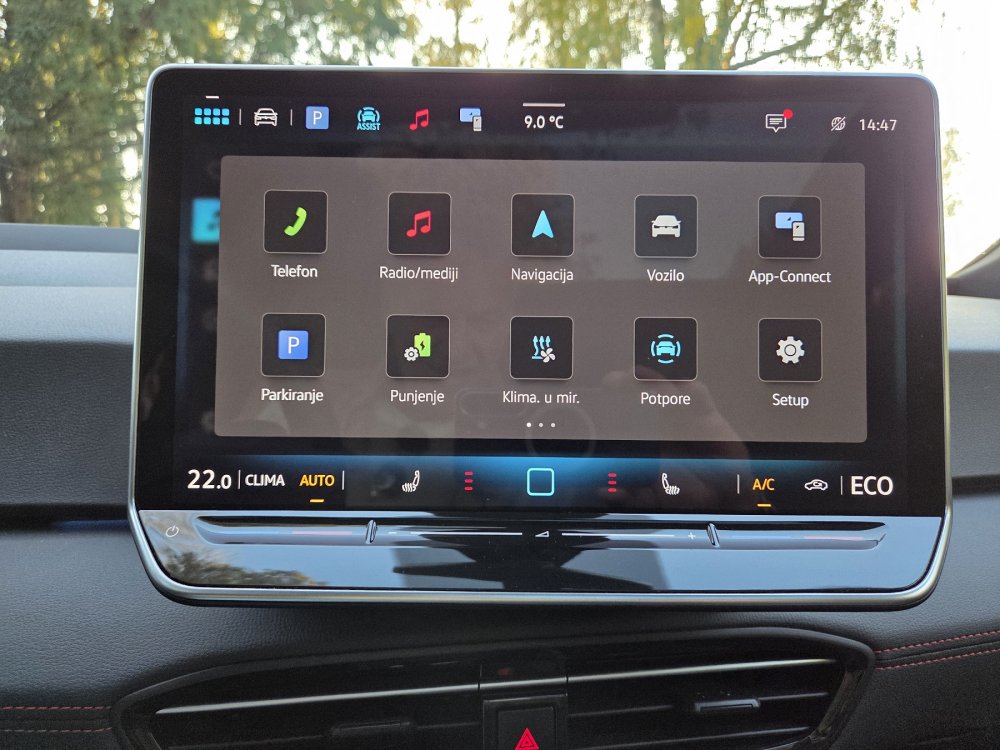 Početni zaslon u sredini kombinira sadržaj najvažnijih aplikacija na pločicama različitih veličina u preglednom prikazu. Uz klasičan sadržaj poput navigacije i upravljanja telefonom, nude se nove funkcije poput prijedloga glasovnog asistenta IDA. Donja traka sadrži funkcije klima uređaja i ventilacije, kao i grijanje sjedala. Središnji gumb za početni zaslon također je integriran u sredinu – korisnik ga može koristiti za povratak na početni zaslon u bilo kojem trenutku. Izbornik klima uređaja i postavke temperature stoga su uvijek izravno dostupni. Ispod se nalazi osvijetljena kontrolna traka s prekidačem za svjetla upozorenja i klizačima za kontrolu temperature u unutrašnjosti i glasnoće zvuka.