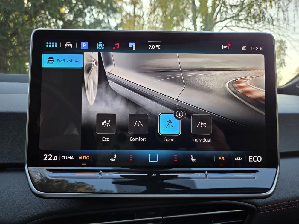 Vozač u našem testnom GTX modelu ima mogućnost korištenja klizne kontrole za podešavanje podvozja na udobniji ili sportskiji način pomoću odabranog profila vožnje: Eco, Comfort, Sport ili Individual.