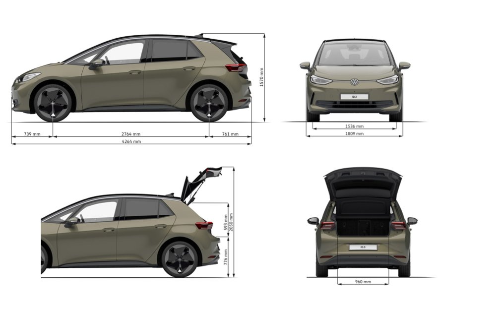 Prema vanjskim dimenzijama, ID.3 GTX je dug 4265 mm, širok 1809 mm (s retrovizorima 2070 mm) i visok 1563 mm, a međuosovinski razmak mu je 2770 mm. Visina od podloge (uključujući vozača od 75 kg je 148 mm, a krug okretanja je 10,5 m. Težina testnog modela je 1985 kg, uključujući vozača od 75 kg.
