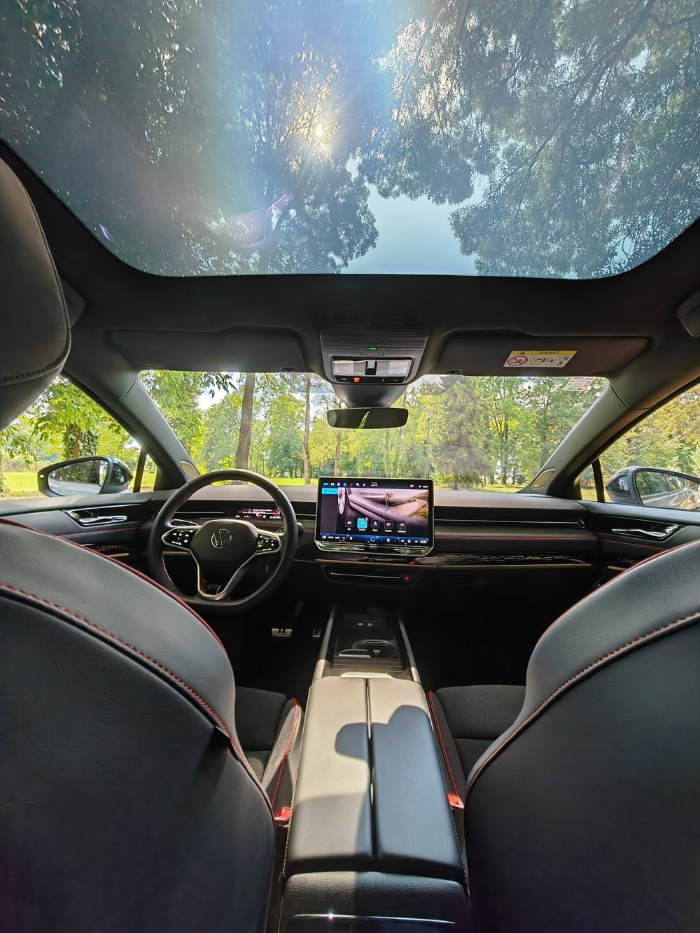 Obje verzije ID.7 GTX dostupne su s panoramskim krovnim otvorom s pametnim staklom (Smart Glass) kao opcijom u našem slučaju s Paketom 'Exterior Plus'. Prozirni krov može se učiniti neprozirnim ili transparentnim u svakom trenutku pomoću sloja polimerno dispergiranih tekućih kristala (PDLC) integriranog u staklo. Prebacivanje se aktivira dodirnim upravljanjem u krovnoj konzoli ili putem glasovnog asistenta IDA. Elektronički PDLC sloj se deaktivira kada je staklo neprozirno. To uzrokuje da se kristali u sloju rasporede tako da staklo više nije prozirno.