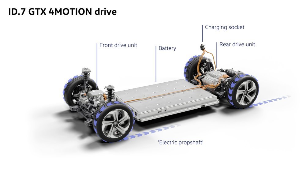 ID.7 GTX i ID.7 GTX Tourer su standardno opremljeni električnim 4MOTION pogonom na sve kotače. Zasebni električni pogonski motor u svakom slučaju pokreće prednju i stražnju osovinu. Zajedno, oba motora pružaju snagu sustava od 250 kW (340 KS) – 40 kW (54 KS) više od snage modela ID.7 Pro i ID.7 Pro S s pogonom na stražnje kotače.