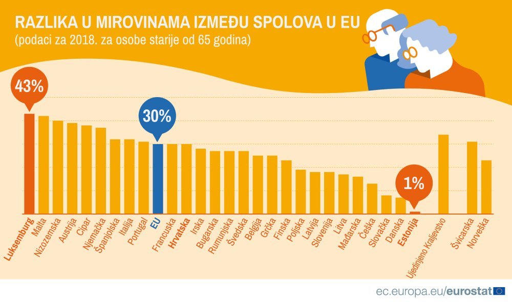 Razlike između mirovina muškaraca i žena u Hrvatskoj iznose ravno 30 posto, pokazuje statistika, što nas svrstava u prosjek EU-a i skupinu zemalja poput Francuske, Portugala, Irske i Italije.