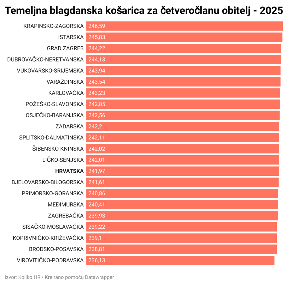 Najskuplja je Virovitičko-podravska županija s 351,98 eura, a prate ju Krapinsko-zagorska (349,88) i Dubrovačko-neretvanska županija (348,61). Ova je košarica najjeftinija u Koprivničko-križevačkoj (330,92), Ličko-senjskoj (335,2) i Brodsko-posavskoj županiji (336,84).
