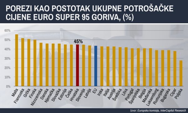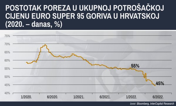 Kao što se može vidjeti iz grafa, na 45 posto poreza u ukupnoj cijeni Hrvatska nije toliko daleko od usporedivih zemalja. Slovenija također ima 45 posto poreza u ukupnoj cijeni, Rumunjska ima 39 posto, Mađarska 41 posto, dok je prosjek EU-a 44 posto. Ovo znači da od ukupne cijene od 1,87 eura po litri koja se u Hrvatskoj plaća za Euro Super 95, EUR 0,84 eura po litri odlazi državi. Nedavna vladina objava o sniženju trošarina i marža distributera (s EUR 0,11/l na EUR 0,086/l) znači da su trenutne cijene pod kontrolom. Vlada još ima mjesta za smanjenje ukupnih poreza i trošarina, nešto što su do sada učinili već nekoliko puta, smanjujući ovaj postotak s otprilike 55 posto u ukupnoj cijeni na početku 2022. godine, na otprilike 45 posto danas.