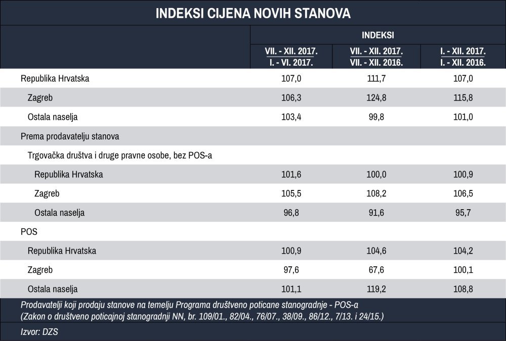 Prema podacima Državnog zavoda za statistiku, prosječna cijena četvornog metra novih stanova u Zagrebu iznosila je u drugom polugodištu prošle godine 12.390 kuna (1654 eura), što je čak 24,8 posto više nego godinu prije. Pritom treba naglasiti da su u izračun prosječne cijene uključeni i stanovi POS-a koji su znatno jeftiniji od ostalih.