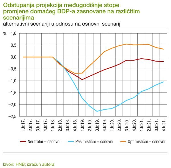Za razliku od negativnog utjecaja neutralnog i negativnog scenarija na prognozu realne aktivnosti, optimistični bi scenarij, osim u kratkom roku, imao pozitivan učinak na domaću realnu aktivnost u visini 0,5 postotnih bodova.