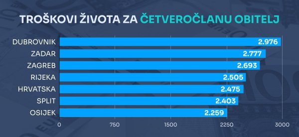 Turistička meka Dubrovnik je uvjerljivo najskuplji za život. Samcu treba 879 eura za osnovne potrebe, što je 24 posto više od hrvatskog prosjeka. Četveročlanoj obitelji je za pokrivanje troškova u Dubrovniku potrebno osigurati gotovo 3000 eura, što je dvadesetak posto više od nacionalnog prosjeka.