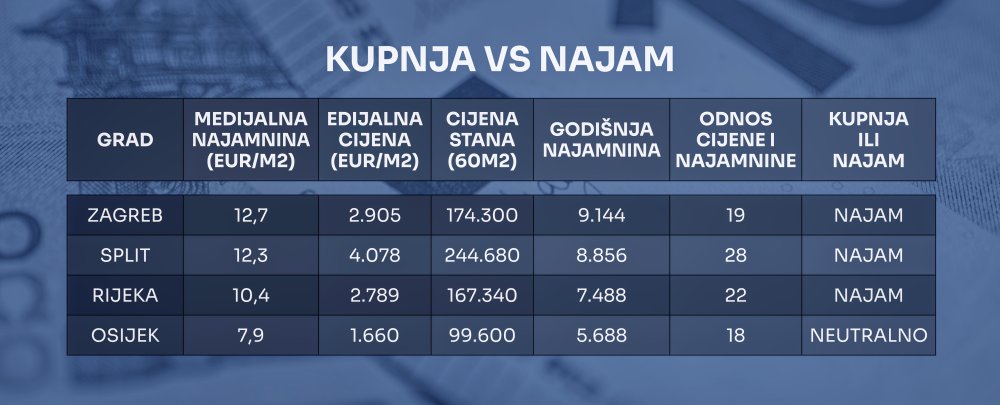 Okvirni izračun za stan veličine 60 kvadratnih metara pokazuje da je najam financijski isplativiji u Zagrebu, Splitu i Rijeci dok su u Osijeku podjednako isplativi kupnja i najam. Najveća razlika u korist najma je u Splitu, gdje omjer cijene i godišnje rente dostiže vrijednost 28, što znači da su cijene stambenih nekretnina izuzetno visoke u odnosu na najamnine. U Zagrebu je omjer oko 19, što znači da je najam blago povoljniji, iako povoljniji kreditni uvjeti mogu prevagnuti u korist kupnje.