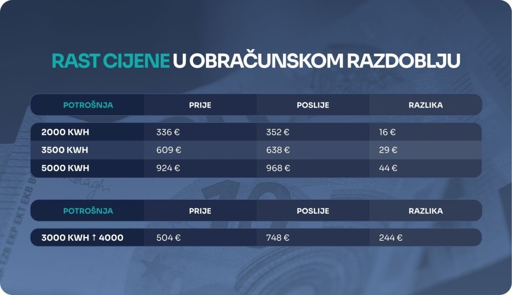 Kućanstvo s potrošnjom od 3500 kWh za šestomjesečno razdoblje mora platiti 29 eura više, odnosno 4,83 eura mjesečno.