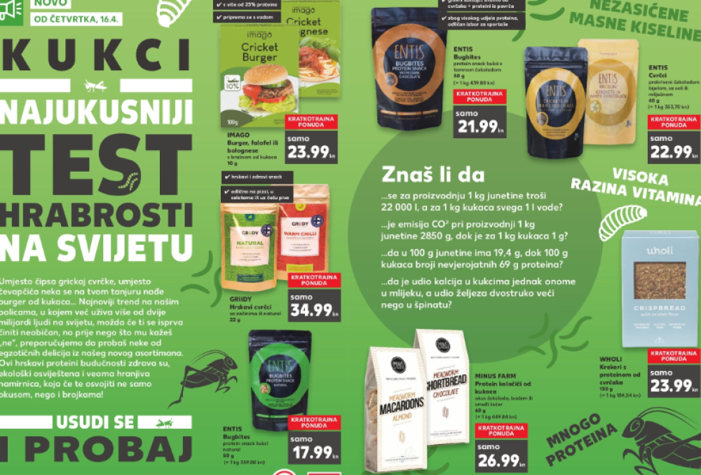 'Umjesto čipsa, grickaj cvrčke, umjesto ćevapčića neka se na tvom tanjuru nađe burger od kukaca...', tako su u najnovijem katalogu Kauflanda oglasili novu ponudu na svojim trgovačkim policama.
