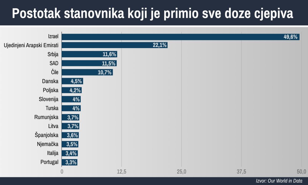 Kada se promatra postotak cijepljenih u odnosu na ukupan broj stanovnika, daleko najuspješniji je Izrael, u kojem je najmanje jednu dozu cjepiva primilo gotovo 60 posto stanovnika, a 48,6 posto stanovnika dobilo je sve doze propisane protokolom cijepljenja.