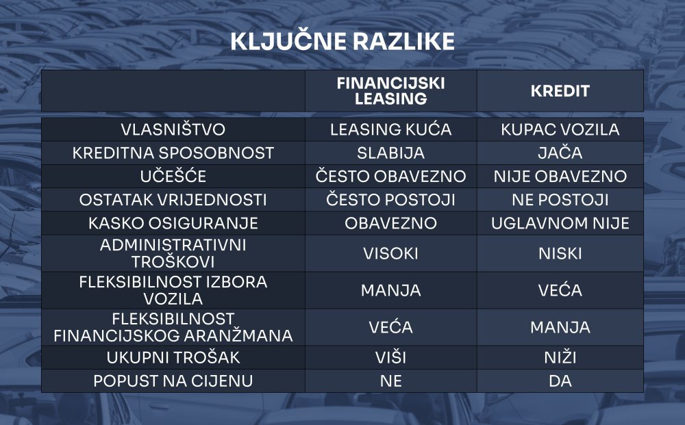 Kupnja automobila za većinu građana predstavlja jednu od većih financijskih odluka. Rijetki su oni koji vozilo mogu platiti odjednom, pa se kao najčešća rješenja nameću kredit ili financijski leasing. No koji je model isplativiji i što treba uzeti u obzir prije potpisivanja ugovora?