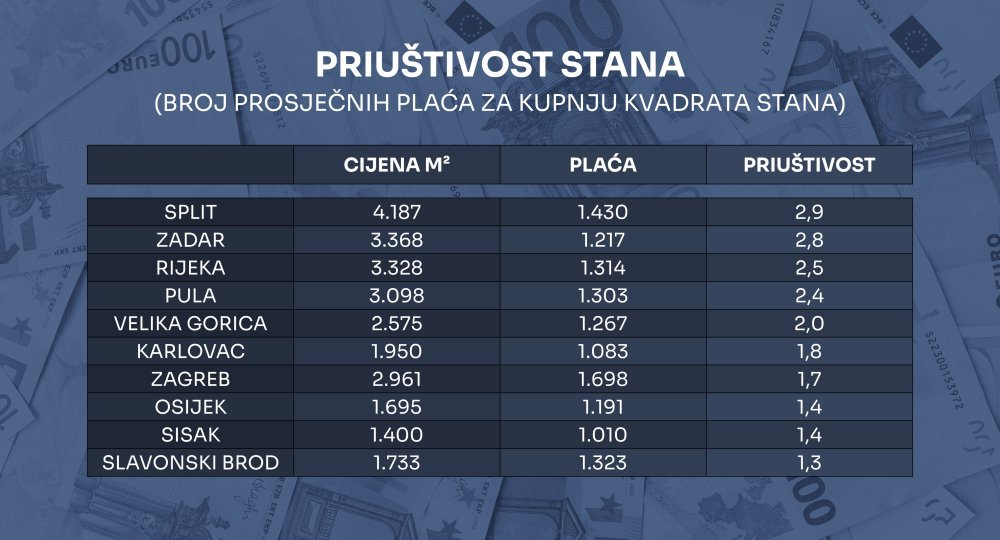 Priuštivost stanovanja u Hrvatskoj jedan je od najvećih socioekonomskih izazova. Posljednjih nekoliko godina cijene nekretnina u većini gradova rastu brže od plaća, pa je vlastiti stambeni prostor sve teže dostupan. Provjerili smo u kojim su velikim gradovima stanovi najpovoljniji u odnosu na primanja, a gdje je priuštivost najniža