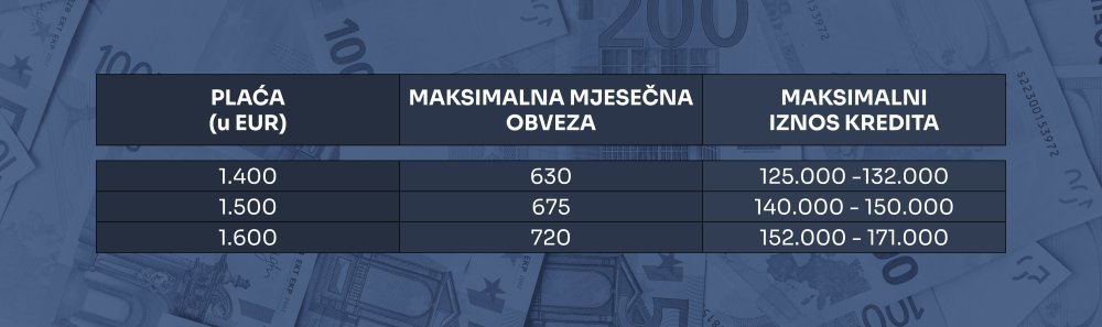 S prosječnom neto plaćom od oko 1500 eura moguće je podići kredit s maksimalnom mjesečnom ratom od 675 eura. Na rok otplate od 30 godina to znači kredit u rasponu od približno 140.000 do 150.000 eura, ovisno o kamatnoj stopi, a ona se trenutačno kreće između tri i četiri posto.