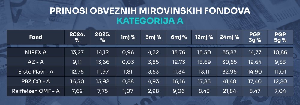 Prema podacima portala hrportfolio.hr, ove godine najveće je prinose u kategoriji A ostvario Fond PBZ CO – čak 15,92 posto – slijedi ga AZ (13,66 posto) te Erste Plavi (11,97 posto). Isti je redoslijed i kad se gleda prinos u posljednjih 12 mjeseci, ali s nešto snažnijim brojkama, što sugerira da je trenutno investicijsko razdoblje u rizičnijim kategorijama financijskih papira povoljno.