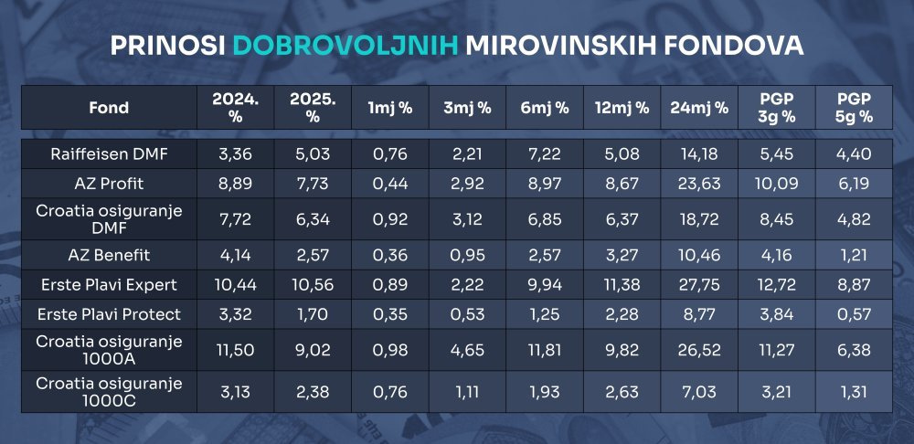 Prema podacima Hrportfolija, fond s najvećim prinosima ove godine je Erste Plavi Expert, čiji prinosi iznose 10,56 posto. Nešto iznad devet posto prinosa ostvaruje fond Croatia osiguranje 1000A, a AZ Profit 7,73 posto. Svi ostali su na razini ispod sedam posto.