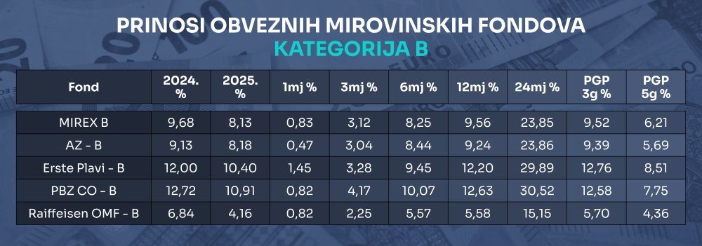 Što se tiče kategorije B, prosječni Mirex u ovoj godini iznosi 8,13 posto. Pritom se ponovno izdvajaju PBZ CO i Erste Plavi kao fondovi s najvišim prinosima u ovoj kategoriji (10,91, odnosno 10,4 posto). Riječ je ujedno o jedinim fondovima koji na srednji i dulji rok imaju dvoznamenkaste prinose, a najslabiji je ponovno Raiffeisenov fond.