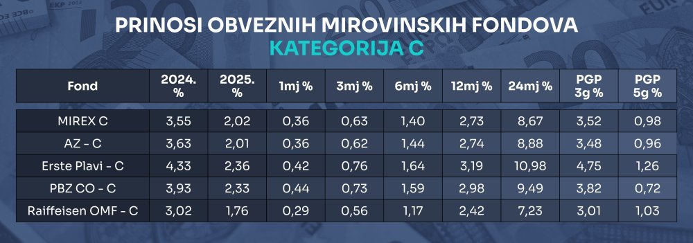 U kategoriji C, koja je po ulaganjima konzervativna i služi za očuvanje ušteđevine članovima koji će uskoro ići u mirovinu, prosječni prinosi u ovoj godini iznose svega 2,02 posto. Ovdje su ujedno najmanje razlike među prinosima fondova. Pritom je za ovu kategoriju najplodonosnije razdoblje bilo prije dvije godine, kad su se prinosi u pojedinim fondovima kretali gotovo oko 11 posto, mahom zahvaljujući izdanjima državnih obveznica i trezorskih zapisa koja su počela u to vrijeme.