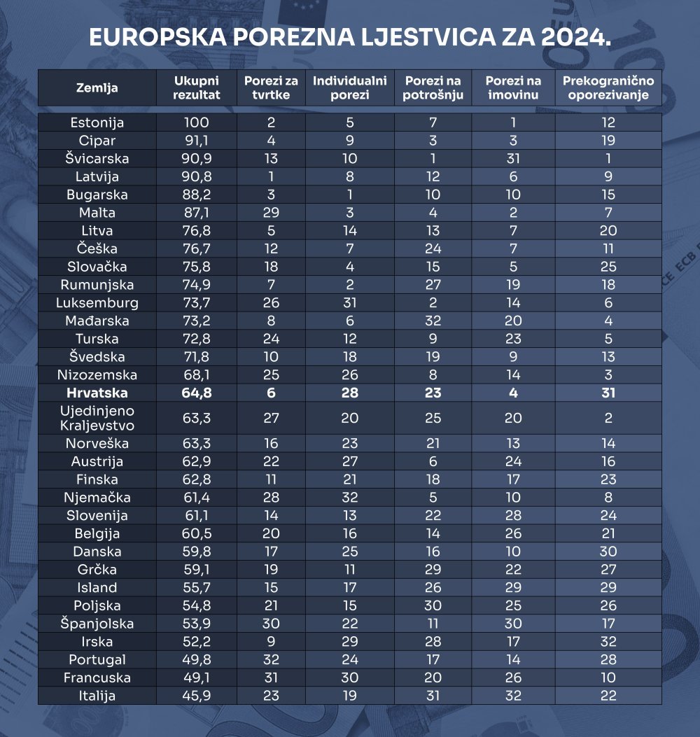Na samom vrhu ukupne ljestvice nalazi se Estonija, a visoko su plasirane i Latvija i Bugarska. Estonija se ističe porezom na dobit koji se primjenjuje samo na raspodijeljenu dobit, jednostavnim proporcionalnim porezom na dohodak te teritorijalnim sustavom oporezivanja inozemne dobiti.