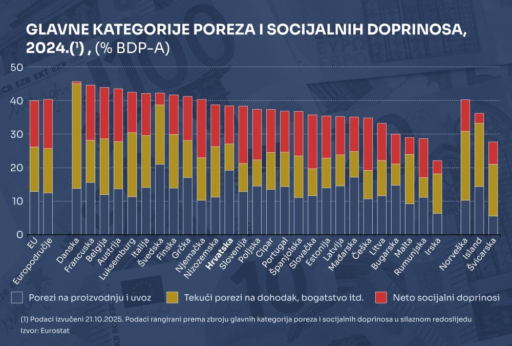Prema dostupnim podacima, udio poreza i doprinosa u BDP-u u Hrvatskoj iznosi 38,5 posto, nešto ispod prosjeka Europske unije, a on se kreće oko 40,1 posto. Hrvatska se tako nalazi u zlatnoj sredini po razini fiskalnog opterećenja, no stručnjaci upozoravaju: visina poreznog opterećenja sama po sebi ne govori mnogo o konkurentnosti poreznog sustava.