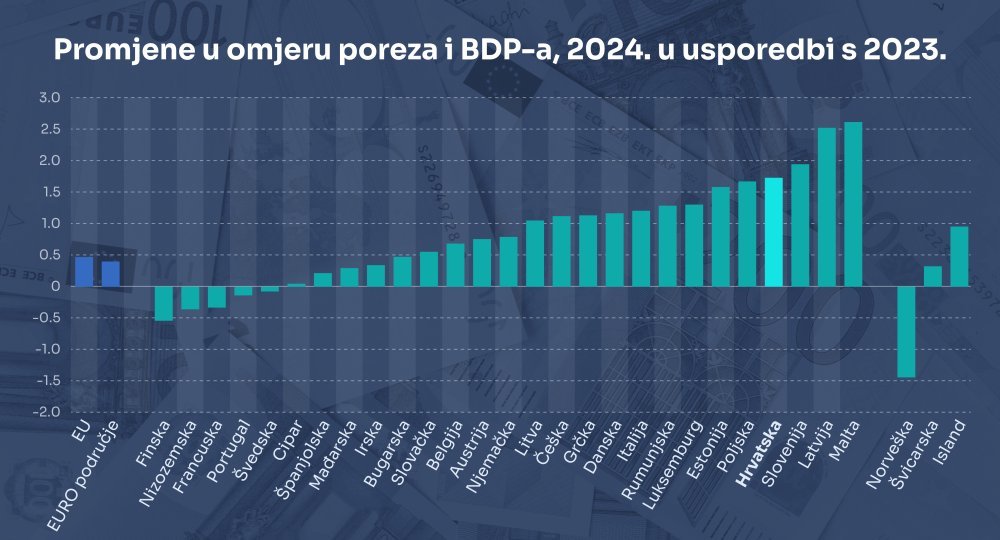 Samo nekolicina zemalja smanjila je u 2024. godini porezno opterećenje: Finska (-0,6 pb), Nizozemska (-0,3 pb), Francuska (-0,3 pb), Portugal (-0,2 pb) i Švedska (-0,1 pb).