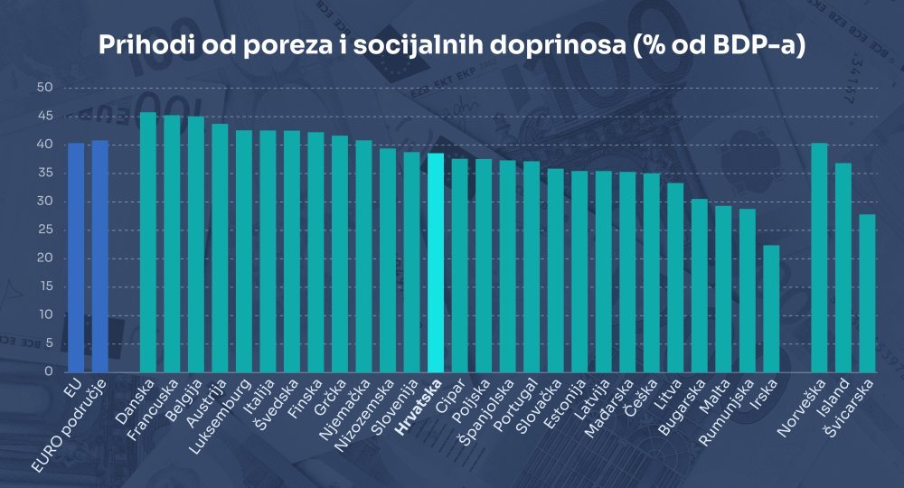 Hrvatska je s udjelom od 38 posto poreznih i socijalnih prihoda u BDP-u u 'zlatnoj sredini' EU-ove ljestvice, malo ispod prosjeka Unije.