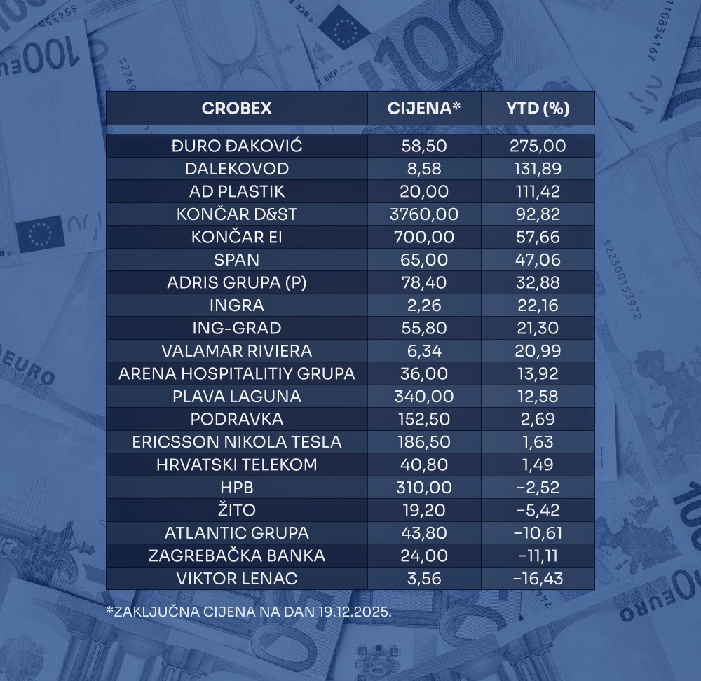 Godina 2025. donijela je nastavak pozitivnih trendova na hrvatskom dioničkom tržištu. CROBEX indeks je ojačao gotovo 20 posto, zahvaljujući nekolicini vodećih dionica iz pobjedničkih sektora. Godinu je obilježio i izniman rast burzovnog prometa čemu su značajno pridonijela tri nove inicijalne javne ponude (IPO), koje su privukle veliki broj malih ulagača. Provjerili smo koje dionice su ulagačima donijele najveću zaradu, a koje nisu opravdale očekivanja