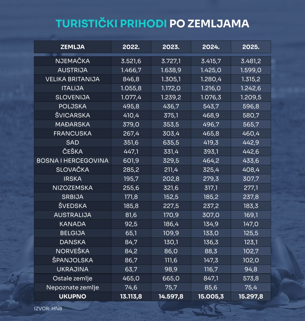 Unatoč negativnim trendovima, Njemačka i dalje ostaje najvažnije emitivno tržište za Hrvatsku s tri milijuna dolazaka i 21 milijun noćenja u 2025. godini. Slijede turisti iz Austrije, Velike Britanije, Italije, Slovenije i Poljske.