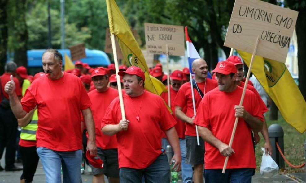 Prosvjednici su jutros u organizaciji Sindikata PPDIV-a autobusima stigli na zagrebački Glavni kolodvor odakle su u povorci krenuli preko Mihanovićeve ulice i Trga Marka Marulića do sjedišta Hrvatskih šuma u Vukotinovićevoj ulici, noseći transparente 'Proizvodnja i radna mjesta, a ne Zavod', 'Umorni smo od obećanja', 'Uzeli ste nam radna mjesta, uzmite i nas', 'USKOK-nite malo kod nas' i sl.