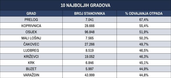 Među 10 najvećih hrvatskih gradova, najuspješniji je Osijek, u kojemu se odvaja više od 50 posto prikupljenog otpada. Solidne rezultate postižu Varaždin, Velika Gorica i Slavonski Brod, a Zagreb je u zlatnoj sredini. Pula i Rijeka zaostaju za prosjekom, a na začelju su Split, Karlovac i Zadar.