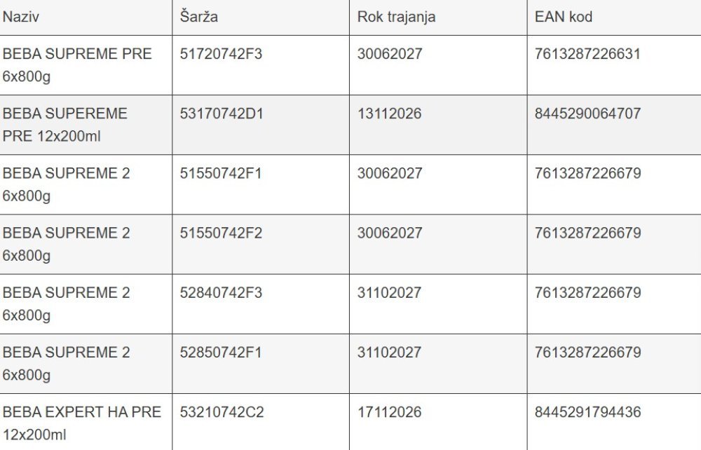 Iz prodaje se povlače proizvodi Nestle BEBA pre, BEBA expert, BEBA comfort, BEBA supreme. Proizvodi su povučeni jer nisu u u skladu s Uredbom (EU) 2023/915 o najvećim dopuštenim količinama određenih kontaminanata u hrani.