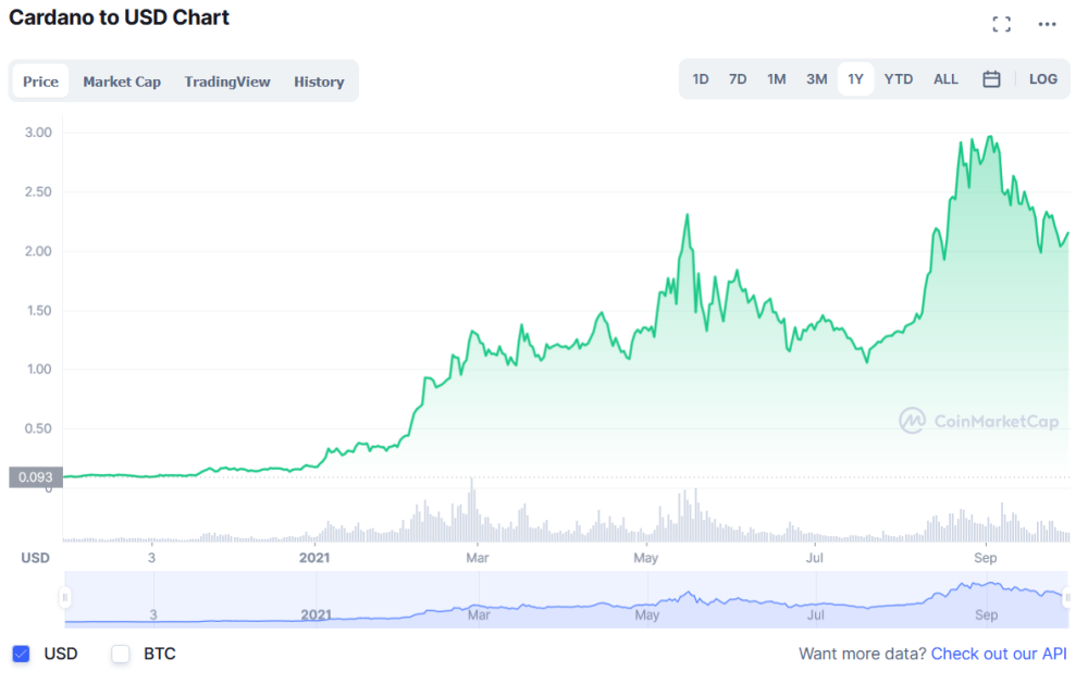 Rujan je bio stresan i za ulagače u cardano, kriptovalutu po prirodi sličnu etherumu, dizajniranu za pokretanje pametnih ugovora i izgradnju decentraliziranih aplikacija. Cardano troši manje energije od provjerenih blockchaina i već ima nekoliko zanimljivih slučajeva korištenja. Cijena cardana u rujnu je skliznula preko 20 posto, ali to nije značajnije narušilo dobitke ostvarene u eksplozivnom rastu tijekom veljače i kolovoza. Na godišnjoj razini tržišna vrijednost ove valute uzletjela je 2173 posto, tri puta više nego etheruma.