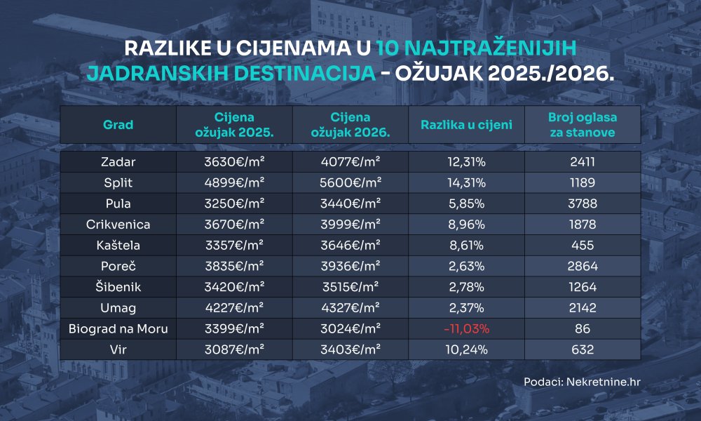 Podaci koji se mogu pronaći na portalu Nekretnine.hr govore o rastu cijena u gotovo svim najtraženijim obalnim destinacijama. Tako su u ožujku ove godine cijene po kvadratu, u odnosu na isti mjesec lani, najviše porasle u Splitu, za 14,31 posto. Konkretno, kvadrat stana je prije godinu dana u prosjeku koštao 4899 eura, da bi se prošlog mjeseca popeo na 5600 eura. To su ujedno i najviše zabilježene cijene u najtraženijim destinacijama, ali i rast koji je na godišnjoj razini zabilježen u cijeloj Hrvatskoj.