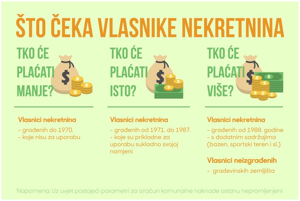 Umjesto dosadašnje formule za komunalnu nakladu u kojoj su, uz vrijednost boda, parametri bili namjena i lokacija (zona), ubuduće će se pri izračunu porezne osnovice uzimati u obzir još dva koeficijenta - starost i stanje nekretnine. Na taj način kriteriji će biti bliži plaćanju prema vrijednosti nekretnine.